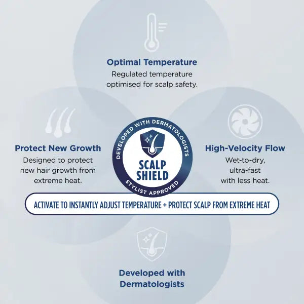 Scalp Shield Mode: Activate to instantly reduce air temperatures to the optimum safe level for scalp comfort and root drying. Designed to protect new hair growth from extreme heat. Developed with dermatologists. Approved by stylists.