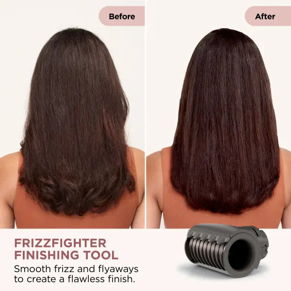 FrizzFighter Finishing Tool: Automatically attracts hair, fights frizz*, and smooths flyaways*. It uses Coanda airflow technology with two streams of air to collect and reduce flyways* on dry, straight or straightened hair.